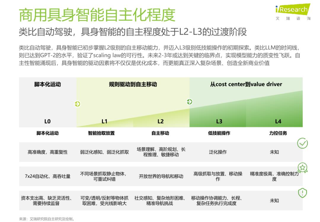 具身智能的自主化程度可分为五个等级:L0脚本化运动(高准确度、高重复性)、L1智能拾取放置(弱泛化感知、弱泛化抓取)、L2自主移动(场景理解、高阶规划、长程推理)、L3低技能操作(高级抓取与放置、移动操作)、L4力控任务(精准度极高、准确控制力度)。当前行业正处于从技术验证到价值闭环的关键攻坚期。