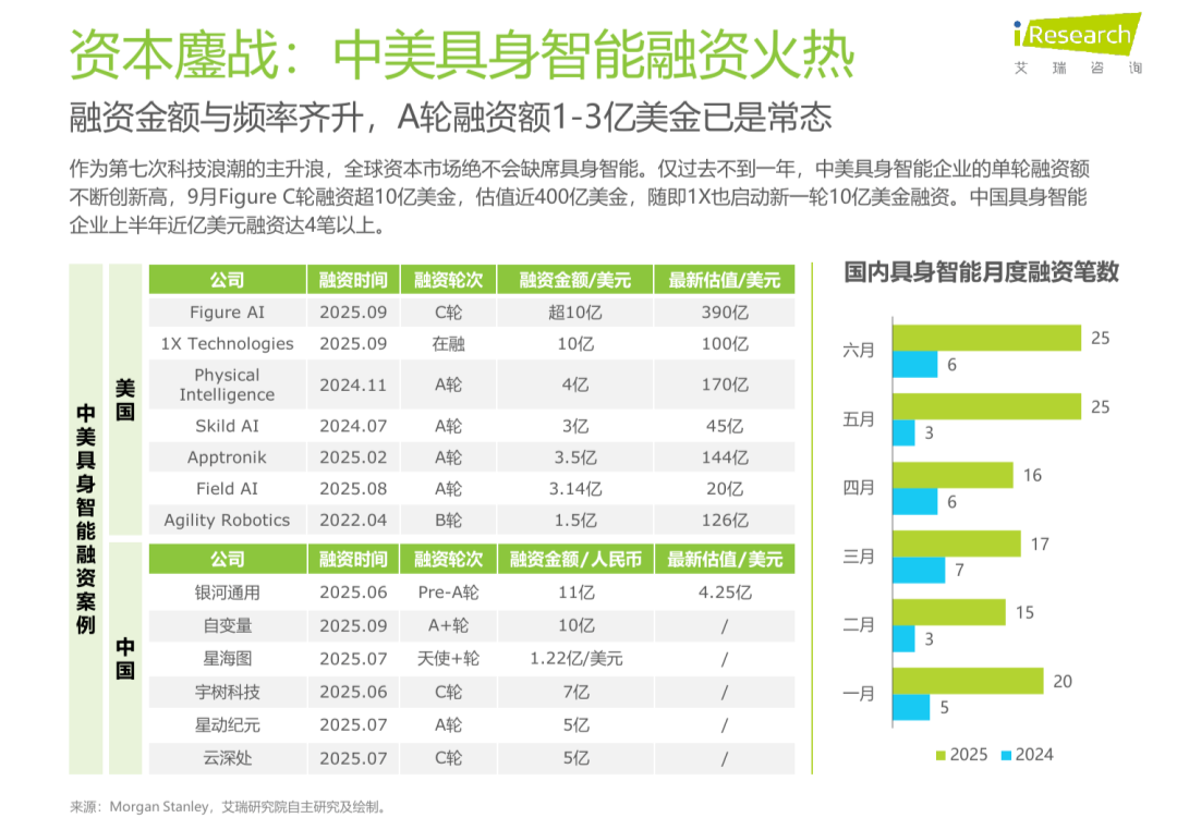 作为第七次科技浪潮的主升浪,全球资本市场绝不会缺席具身智能。仅过去不到一年,中美具身智能企业的单轮融资额不断创新高。2025年9月Figure C轮融资超10亿美金,估值近400亿美金;随即1X也启动新一轮10亿美金融资。中国具身智能企业上半年近亿美元融资达4笔以上。