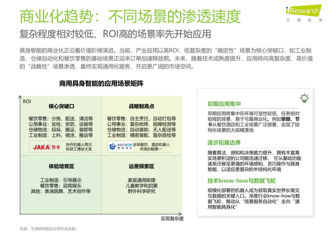 具身智能的商业化正沿着价值阶梯演进。当前,产业应用以高ROI、低复杂度的“确定性”场景为核心突破口,如工业制造、仓储自动化和餐饮零售的基础场景正迎来订单加速释放期。未来,随着技术成熟度提升,应用将向高复杂度、高价值的“战略性”场景渗透,最终实现通用化服务。