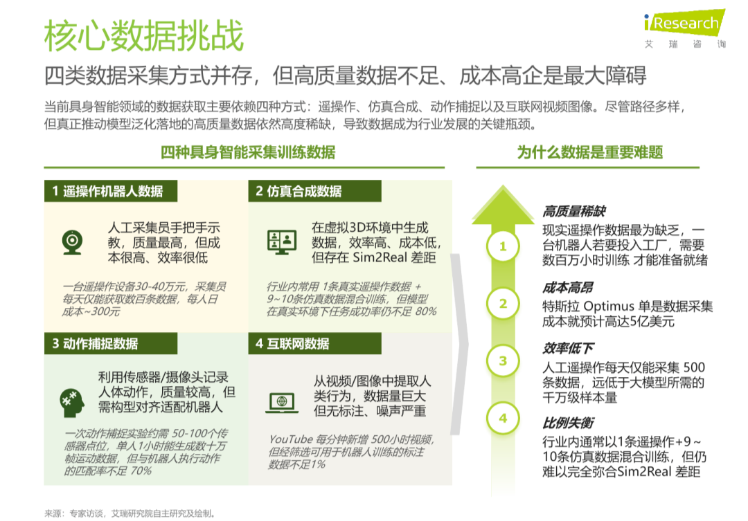 具身智能正加速从实验室走向产业化,但仍面临多重挑战。首当其冲是数据瓶颈:高质量真实操作数据稀缺,采集成本高、周期长;仿真与现实存在显著Gap,限制模型迁移效果;缺乏统一标准与共享机制,数据孤岛化严重。
