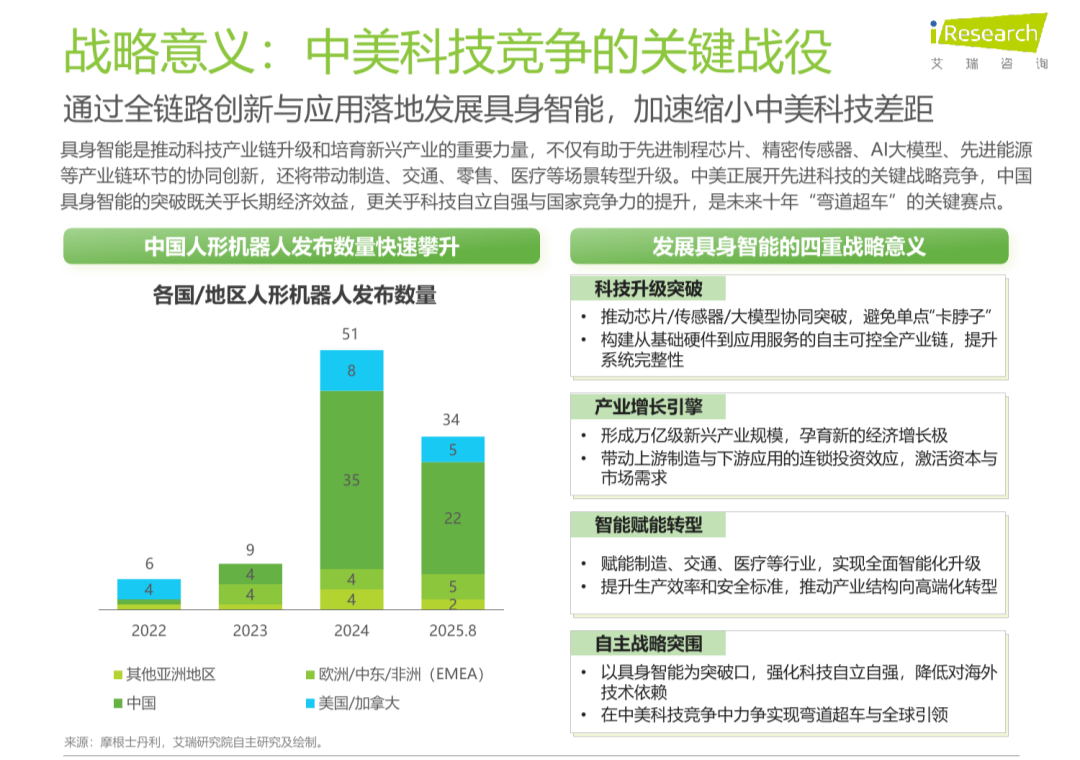 具身智能是推动科技产业链升级和培育新兴产业的重要力量,不仅有助于先进制程芯片、精密传感器、AI大模型、先进能源等产业链环节的协同创新,还将带动制造、交通、零售、医疗等场景转型升级。中美正展开先进科技的关键战略竞争,中国具身智能的突破既关乎长期经济效益,更关乎科技自立自强与国家竞争力的提升。