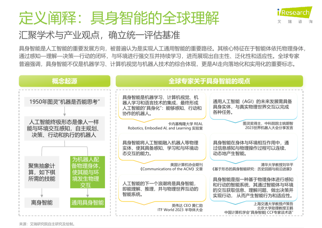具身智能的概念最早可追溯至1950年图灵提出的“机器是否能思考”这一哲学命题。经过70余年的发展,全球学术界和产业界对具身智能的理解逐渐趋同:它是人工智能的重要发展方向,被普遍认为是实现人工通用智能(AGI)的关键路径。