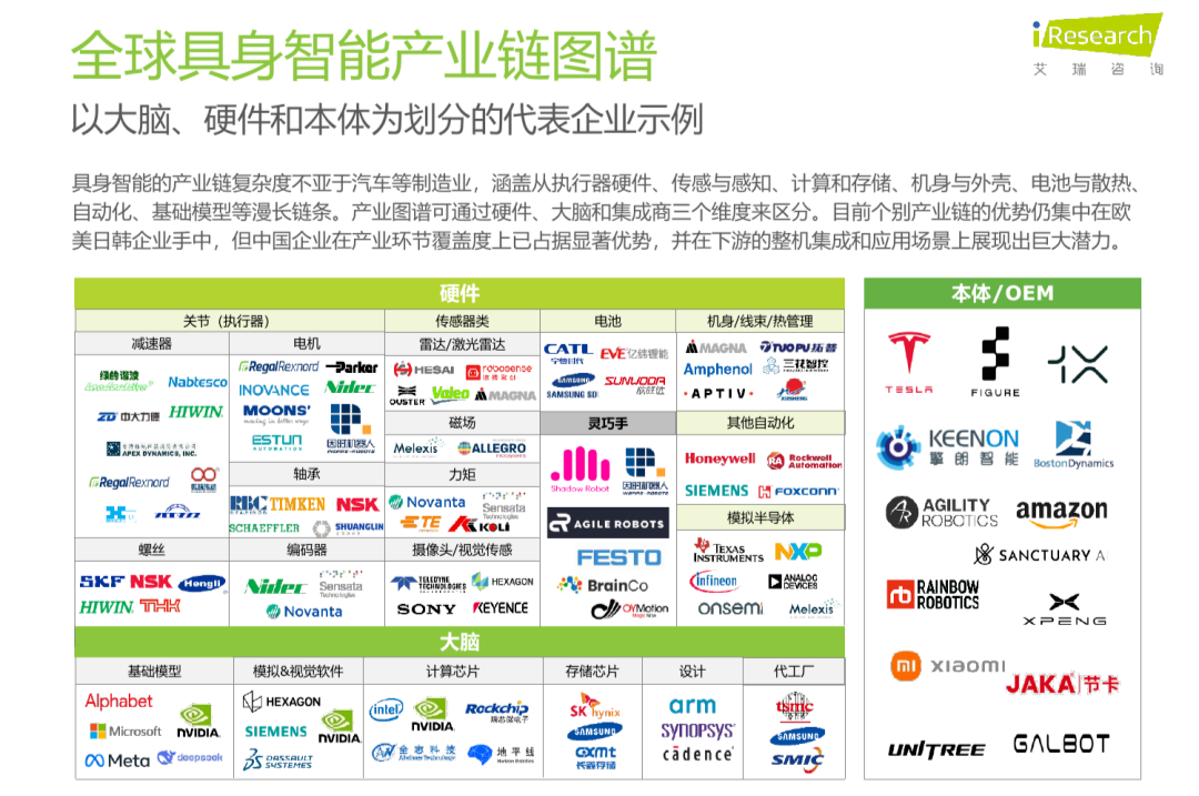 具身智能的产业链复杂度不亚于汽车等制造业,涵盖从执行器硬件、传感与感知、计算和存储、机身与外壳、电池与散热、自动化、基础模型等漫长链条。产业图谱可通过硬件、大脑和集成商三个维度来区分。