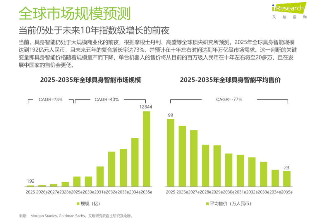当前,具身智能仍处于大规模商业化的前夜。根据摩根士丹利、高盛等全球顶尖研究所预测,2025年全球具身智能规模达到192亿元人民币,未来五年的复合增长率达73%,预计在十年左右时间达到万亿级市场需求。