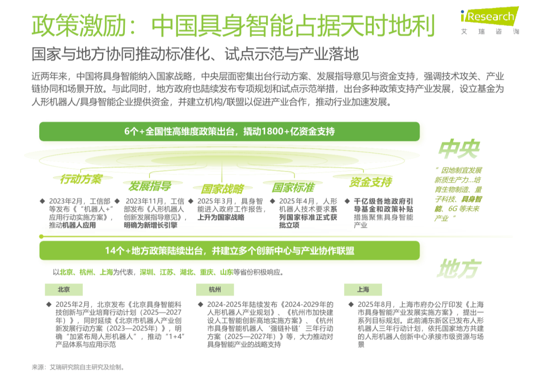 近两年来,中国将具身智能纳入国家战略,中央层面密集出台行动方案、发展指导意见与资金支持,强调技术攻关、产业链协同和场景开放。2025年3月,具身智能进入政府工作报告,正式上升为国家战略;2025年4月,人形机器人技术要求系列国家标准正式获批立项。