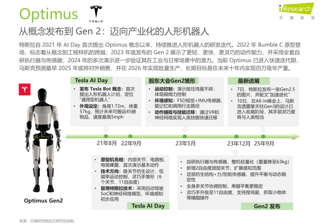 特斯拉自2021年AI Day首次提出Optimus概念以来,持续推进人形机器人的研发迭代。2022年Bumble C原型登场,标志着从概念到工程样机的跨越;2023年底发布的Gen 2展示了更轻、更快、更灵巧的动作能力,采用全套自研执行器与传感器;2024年的多次演示进一步验证其在工业与日常场景中的潜力。