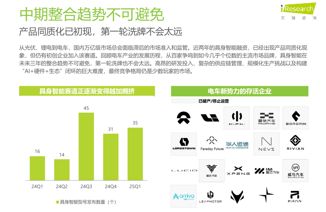 数据显示,2024年Q1至2025年Q1,具身智能型号发布数量从14个增长至35个,赛道正逐渐变得越加拥挤。高昂的研发投入、复杂的供应链管理、规模化生产挑战以及构建“AI+硬件+生态”闭环的巨大难度,最终竞争格局仍是少数玩家的市场。