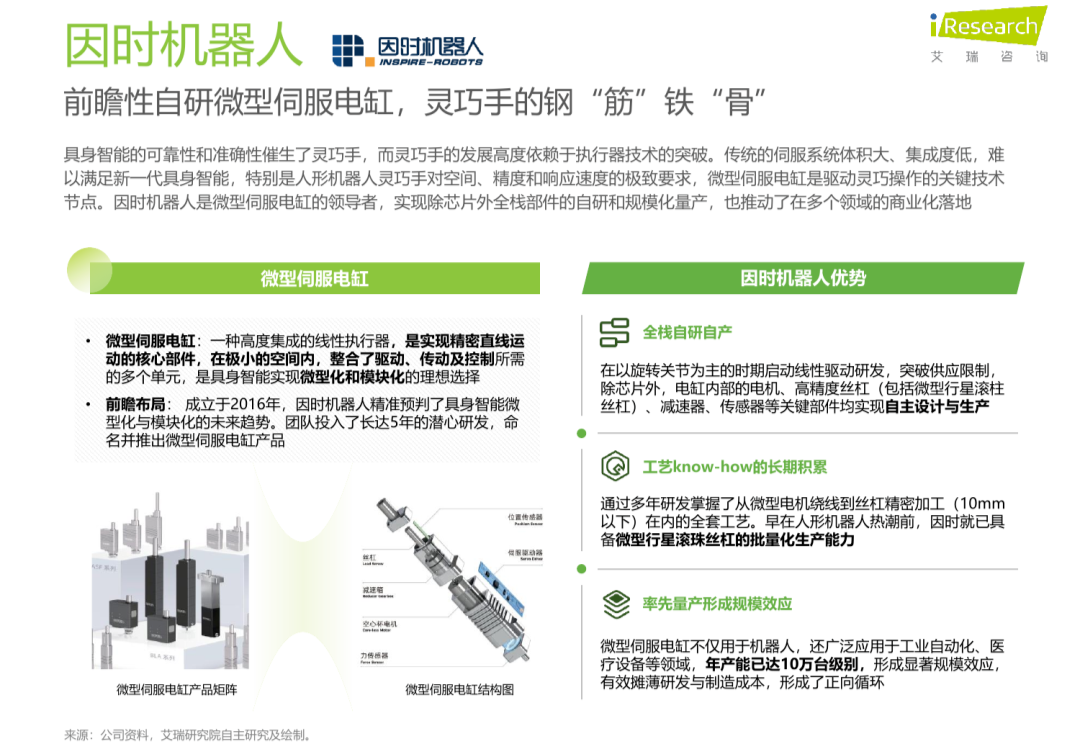 因时机器人成立于2016年,精准预判了具身智能微型化与模块化的未来趋势,投入长达5年的潜心研发,命名并推出微型伺服电缸产品。除芯片外,电缸内部的电机、高精度丝杠、减速器、传感器等关键部件均实现自主设计与生产。2024年灵巧手出货量近2000台,2025年全年销量预计突破万台,市占率超过60%。