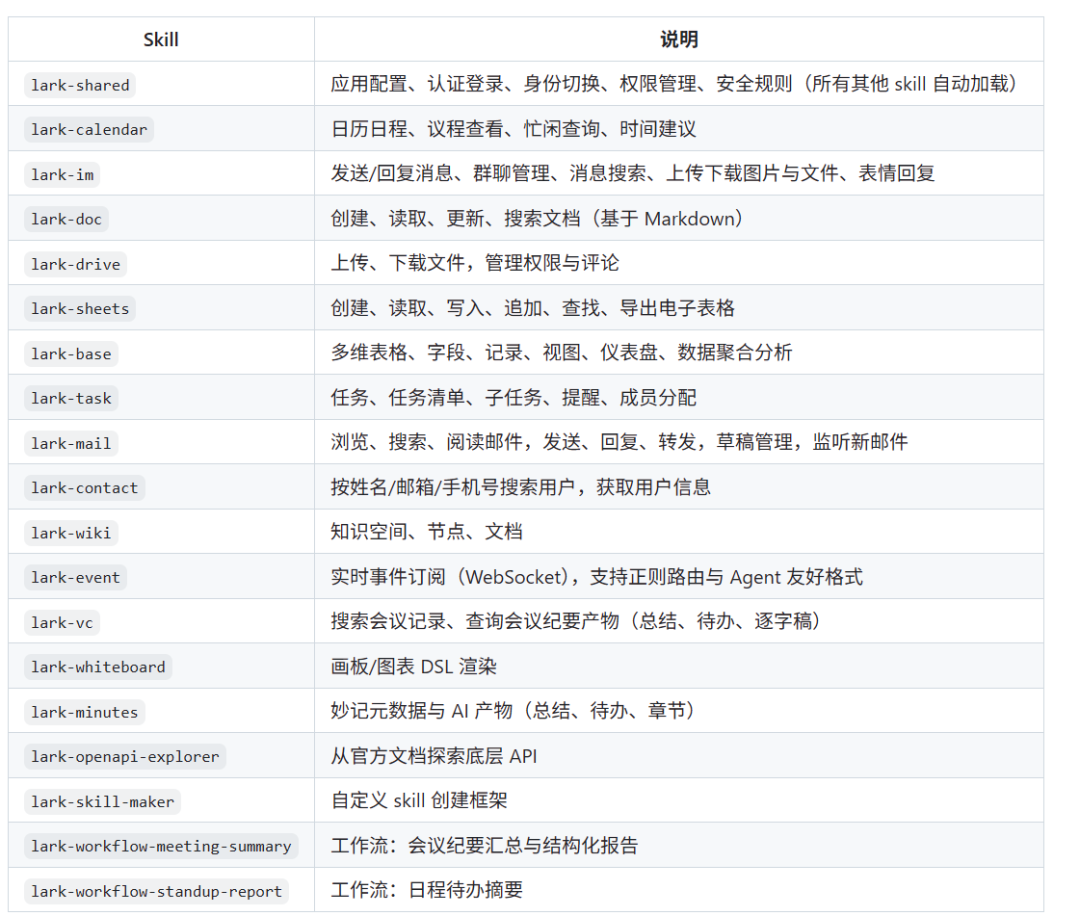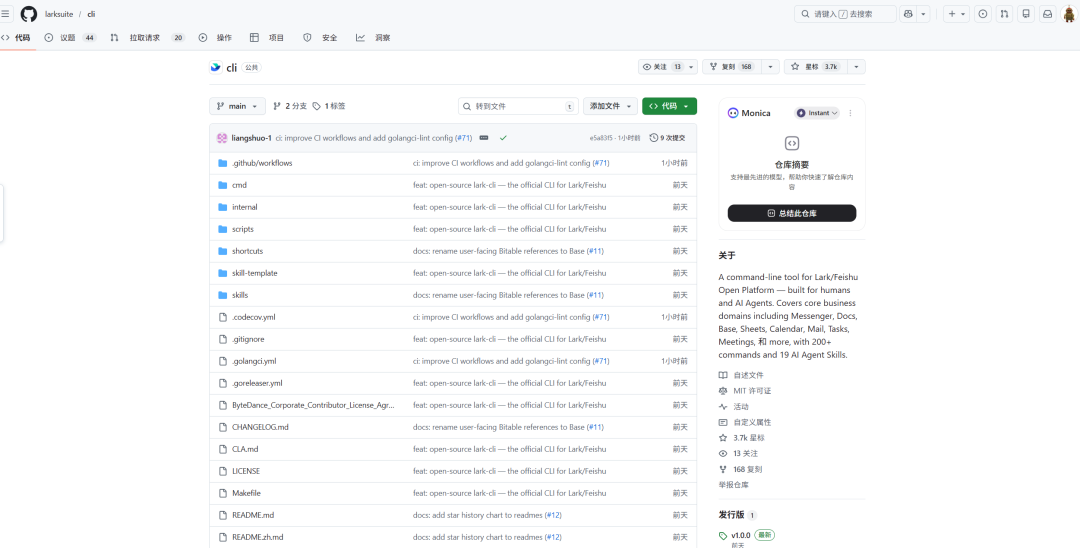 最近飞书开源了自家官方 CLI 工具,简单来说,开源了一款飞书/Lark 开放平台命令行工具,它可以让人类和AI Agent 都能在终端中操作飞书。覆盖了消息、文档、多维表格、电子表格、日历、邮箱、任务、会议等核心业务域,提供200+命令及19个AI Agent Skills。