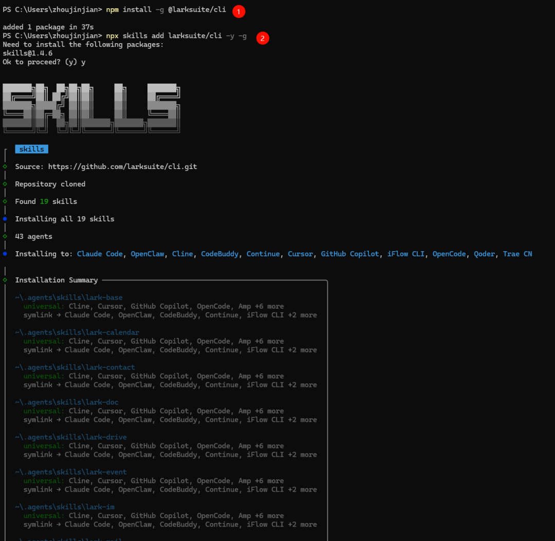 npx skills add larksuite/cli -y -g方式三:让AI帮你自动安装: