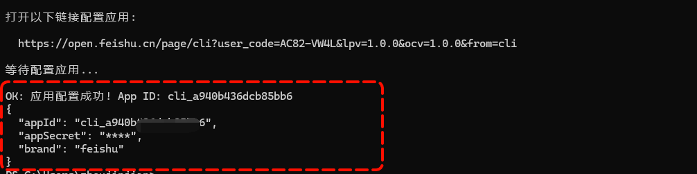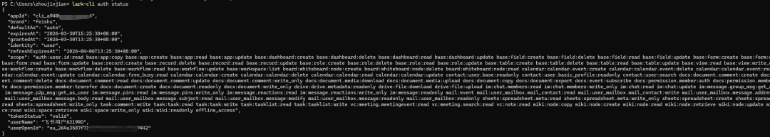 lark-cli auth status如果能正确获取飞书用户信息,以及刚创建并开通的App应用信息,则说明安装成功。