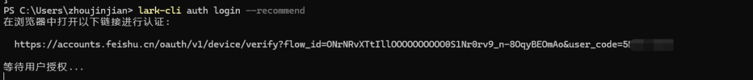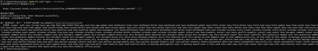 在浏览器中打开以下链接进行认证: https://accounts.feishu.cn/oauth/v1/device/verify?flow_id=ONrNRvXTtIllOOOOOOOOOO0S1Nr0rv9_n-8OqyBEOmAo&user_code=5H7E-xxxx