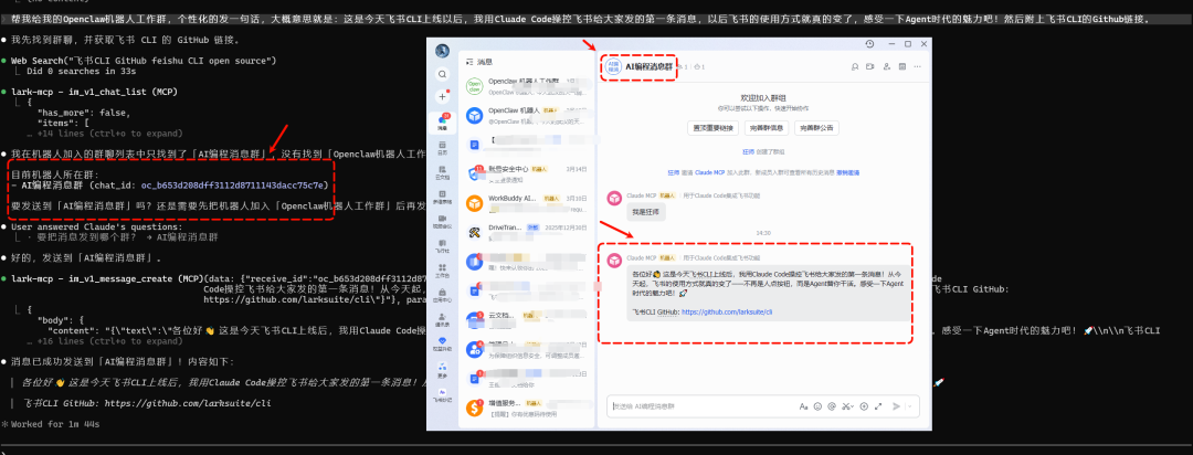帮我给我的Openclaw机器人工作群,个性化的发一句话,大概意思就是:这是今天飞书CLI上线以后,我用Cluade Code操控飞书给大家发的第一条消息,以后飞书的使用方式就真的变了,感受一下Agent时代的魅力吧!然后附上飞书CLI的Github链接。
