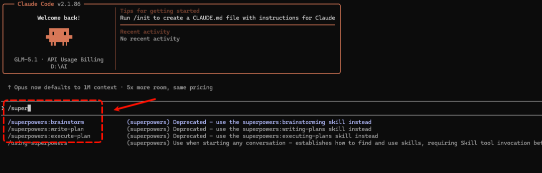 /plugin install superpowers@claude-plugins-official安装后,重启 Claude Code,然后,你的 Claude Code 就获得了一整套 Skills。输入 / 就能看到以 superpowers: 开头的命令。