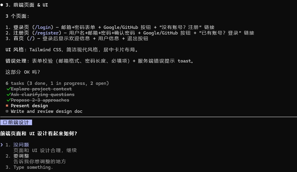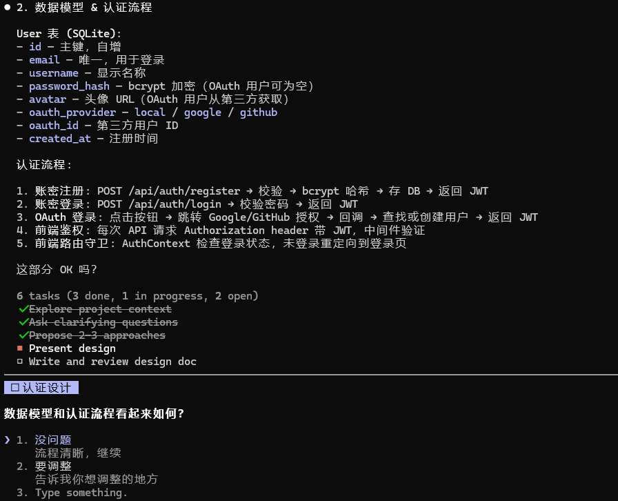 你回答这些问题后,它会生成一个结构化的设计摘要,确认你同意后才进入实现阶段。