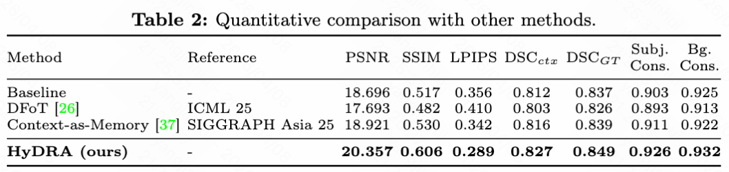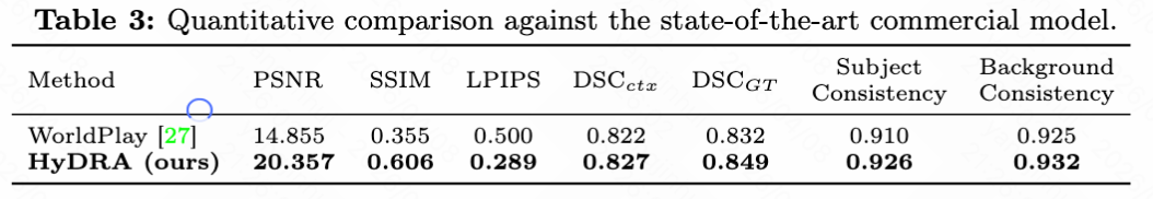 如下表3所示,与最先进的商业模型 WorldPlay 进行零样本评估比较时,HyDRA 在所有指标上均超越 WorldPlay,PSNR 差距达到 5.502。这不仅验证了 DSC 指标的合理性,也凸显了 HyDRA 的卓越性能。
