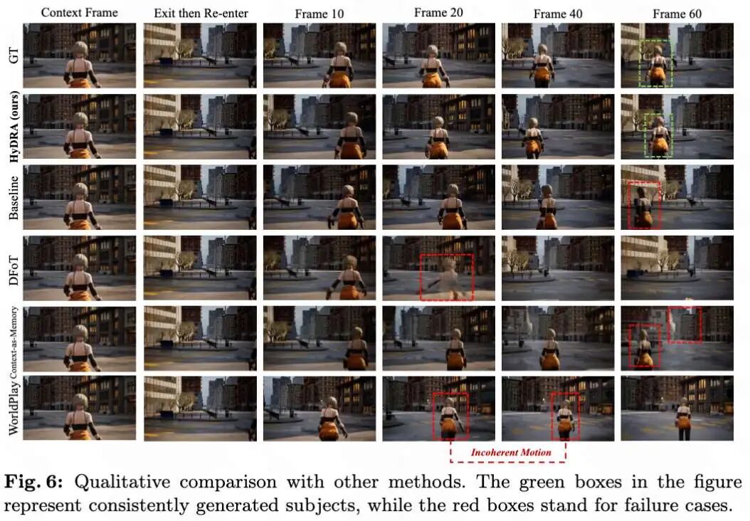 定性比较:如下图6所示,定性结果进一步证实了 HyDRA 的优势。在复杂的退出-进入事件中,基线和 Context-as-Memory 出现严重的主体失真和运动不连贯,DFoT 甚至导致主体完全消失。WorldPlay 虽能保持外观一致性,但存在运动卡顿。相比之下,HyDRA 成功保持了主体的身份和运动连贯性,实现了混合一致性。