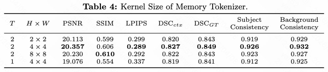 记忆分词器的核大小:如下表4所示,论文研究了记忆分词器中 3D 卷积核大小 的影响。结果表明,模型对空间维度()变化具有鲁棒性,性能差异微小。然而,当时间维度 减小到 1 时,PSNR 和 DSC 显著下降,强调了时间交互对于捕获长期动态信息的必要性。