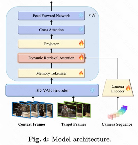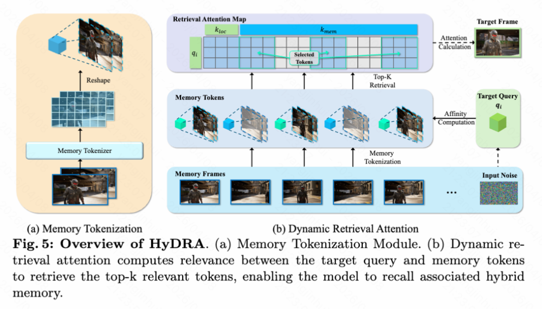 如下图4的模型架构图所示,这一过程在 DiT 块中实现,并如下图5所示的 HyDRA 概览图所示,通过内存分词和动态检索注意力机制,模型能够有选择地关注看不见的主体的最相关的运动和外观线索。