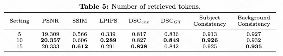 检索到的 token 数量:如下表5所示,论文调查了检索到的记忆 token 数量的影响。检索 5 个 token 导致次优性能(PSNR 为 19.309),表明信息丢失严重。将数量增加到 10 或 15 产生了更好且更稳定的结果,两者差异可忽略不计,这表明适量的 token 足以提供必要信息。
