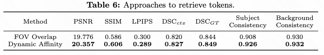 token 检索方法:如下表6所示,论文比较了动态亲和度检索与基于 FOV 重叠的检索方法。动态亲和度方法在所有指标上均优于基于 FOV 的方法,将主体一致性从 0.908 提高到 0.926。这是因为动态亲和度利用 QK 交互评估细粒度时空相关性,而基于 FOV 的方法仅依赖静态几何重叠。补充材料中的下图3和上图4进一步从定性角度验证了动态亲和度在选择关键帧和动态适应性方面的优势。