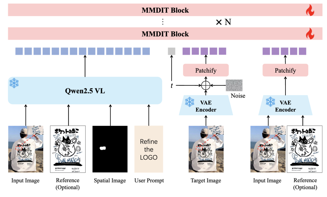 • **冻结的多模态编码器 (Qwen2.5-VL)**:将输入图像、可选的参考图像、区域标注(涂鸦/框选)和文字指令统一编码为多模态条件token,为去噪过程提供高层语义引导。