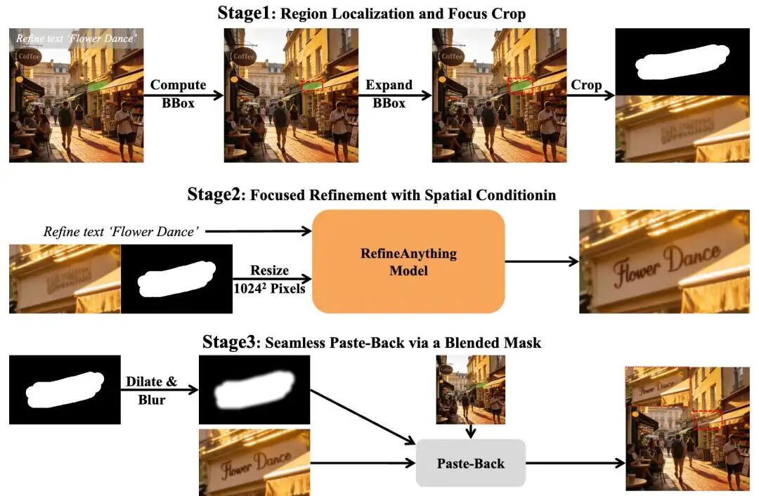 该框架在保证背景像素级不变的前提下,实现了文字、Logo、人脸、手部等精细细节的高质量恢复,为 AI 生图在商业级高精度场景中的落地扫清了"最后一公里"障碍。