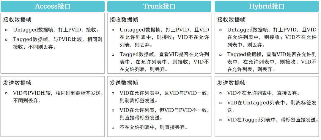 对比维度 | Access端口 | Trunk端口 | Hybrid端口 |