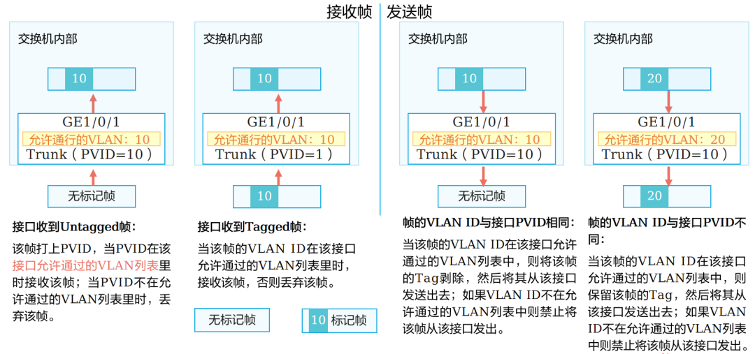 Trunk接口接收数据帧: 分两种情况——① 收到带Tag的数据:若该VLAN在端口“允许透传列表”内,直接保留Tag标签转发至交换机内部;若不在列表内,直接丢弃;② 收到无Tag的数据:自动打上端口的PVID(即Native VLAN)标签,标记后转发,若PVID对应的VLAN不在允许透传列表,同样丢弃。 Trunk接口发送数据帧: 仅剥离「Native VLAN(端口PVID)」的Tag标签,发送无Tag数据;其他允许透传的VLAN,均保留原有Tag标签转发,确保跨设备(交换机、路由器)时,VLAN身份不丢失,设备间能准确识别数据归属。