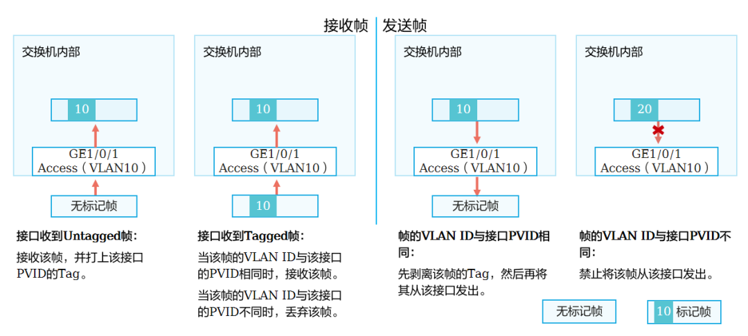终端(PC、打印机等)发送的数据均为无Tag数据,端口接收后,会自动给该数据打上自身PVID(即绑定的VLAN)标签,标记数据归属后,供交换机内部识别和转发;若收到带Tag的数据(非自身绑定VLAN),会直接丢弃,不允许通行。