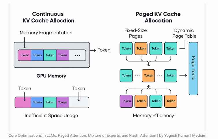 第一,它重新设计了 KV Cache 的管理方式。Paged Attention 让缓存从连续分配走向分页分配,显存碎片和浪费显著下降。
