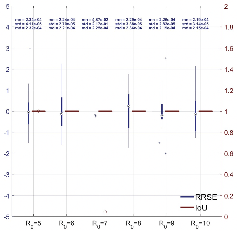 我们看到,RRSE 的中位数保持在 以下,而在大多数情况下,标准差还要再低一个数量级。即使在其他标准差增大到 左右的情形中,相应的箱线图也收缩为单个点,这表明较大的标准差是由少数异常值(显示为蓝色十字)引起的。IoU 的箱线图在所有分组中均为 处的一条直线,仅可见少数异常值(显示为红色圆圈)。鉴于这些异常值的稀疏性,我们得出结论:所提出的模型以高概率实现了原始 RPCC 问题的near-optimal解,考虑到该问题的 NP难性质,这是一个令人惊喜的结果。