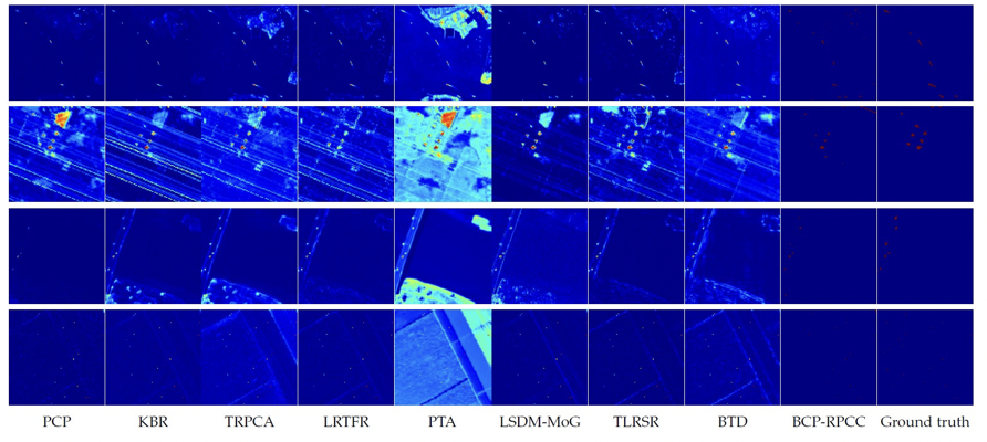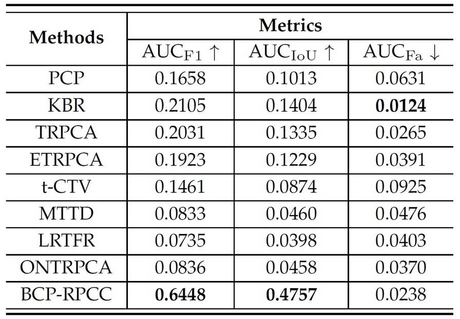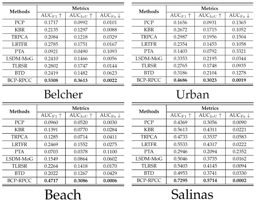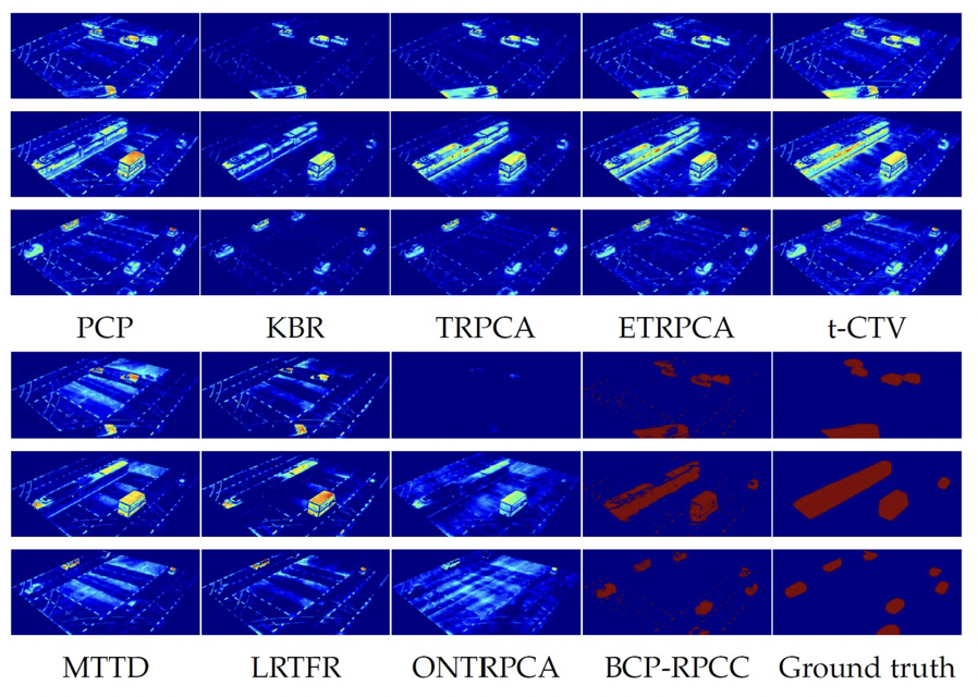 我们在彩色视频及高光谱图像上验证BCP-RPCC的前景提取能力。我们的模型的主要突破点在于对支撑集的直接估计,也即它是“硬分类器”,但主流的通用模型均只能给出的软分类结果。据我们所知,目前并不具备对硬分类器和软分类器直接进行比较的评价指标,为此,我们不得不定制新的指标。