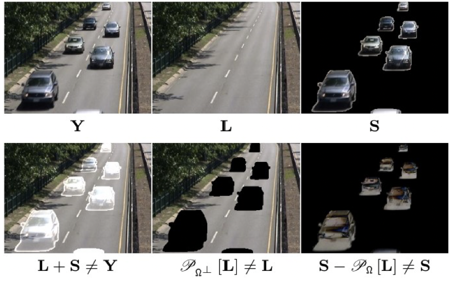 然而,这种 RPCA 形式与许多应用所面临的实际情形存在一定的失配。也就是说,式(1)将稀疏的异常值或离群点 描述为叠加在低维背景 上的加性分量。然而,在大多数实际应用中,异常值在物理上并非“叠加”于背景,而是“取代”或“遮挡”了背景。于是,更准确的低秩-稀疏分解模型应由下式体现:
