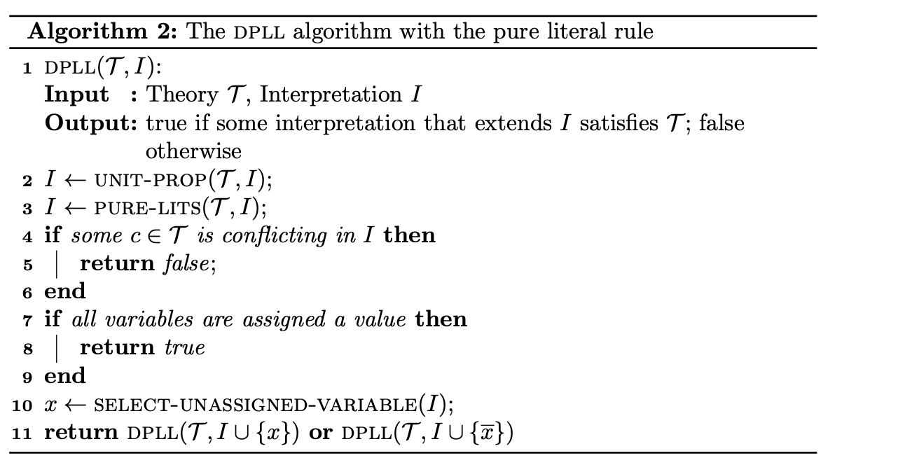 单元传播是首先进行的,因为它可能产生纯文字。然后,DPLL可能会恢复与这些文字相关的变量,从而浪费潜在的指数型时间,在未来对它们进行毫无意义的回溯。通过在单位传播后消除纯文字,函数可以确保对一个变量进行递归,该变量的值可能是正确的,也可能是假的。纯文字总是可以立即设置为TRUE。