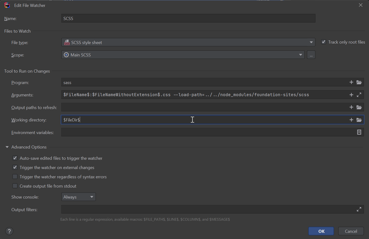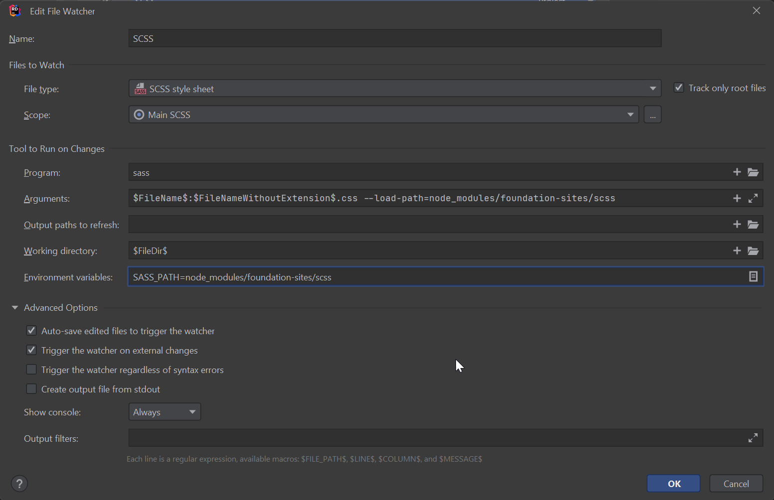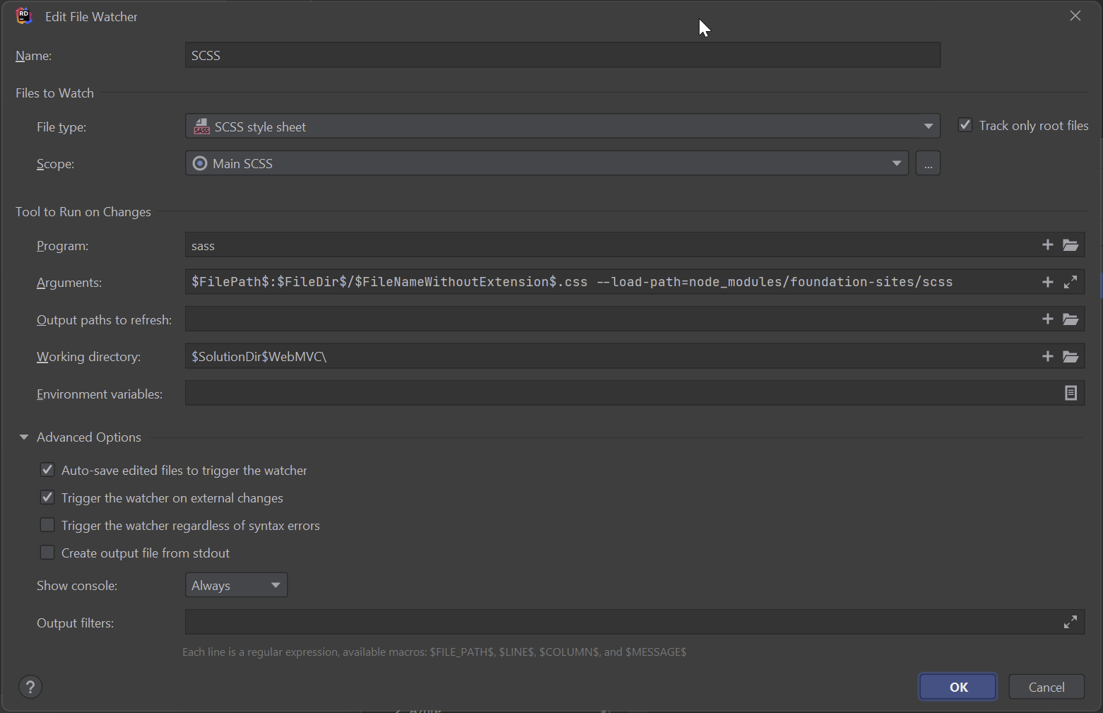 但我就是不能让它起作用。我想使用Rider在我所有的网页开发-因此,任何帮助,使SCSS设置与文件监视将非常感谢。