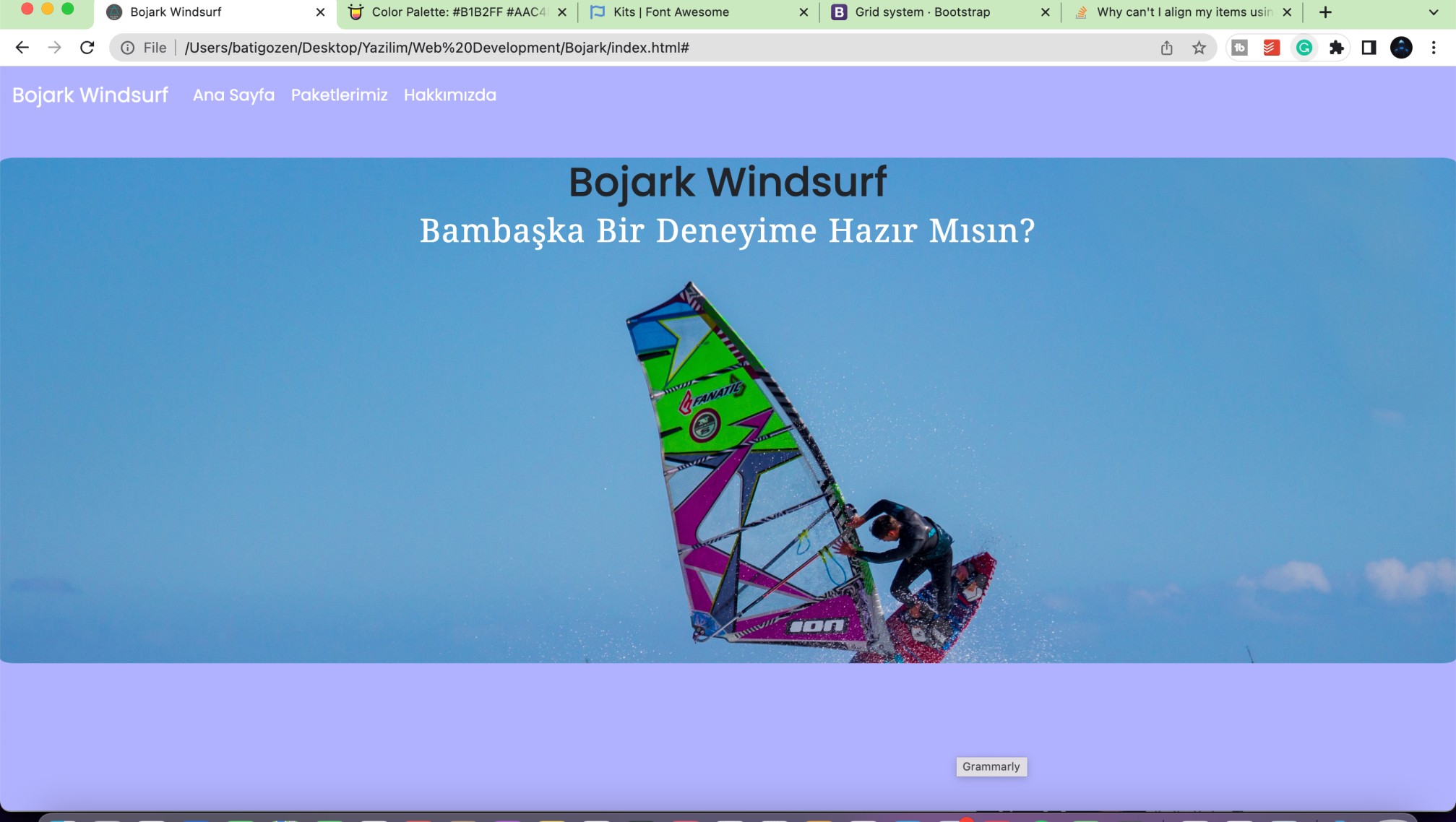 我现在正在做一个风帆冲浪网站。我在这里遇到的问题是,虽然我添加了对齐内容中心、对齐项中心和文本中心类,但h1和h2仍然在顶部。它们水平对齐,但不是垂直排列。请帮帮忙。我的网站现在看起来是这样的:
