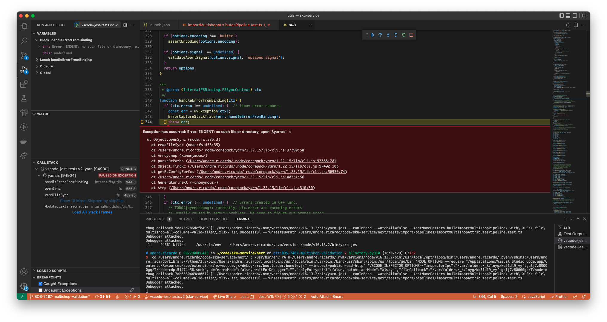 我试图在VS代码中的“捕获异常”处调试Jest测试和断点,但是它停在与我无关的/.node/corepack/yarn/1.22.15/lib/cli.js上。