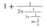 ... '1+ \\frac{1}{2+ \\frac{1}{3+ \\frac{1}{4+ \\frac{1}{5}}}}'要获得我们使用的标记格式: