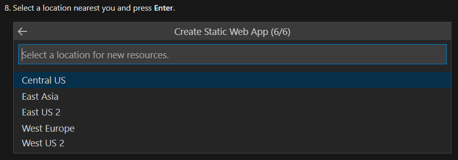 如果它是全局分布的,按照本创建静态web应用程序指南的步骤8所述,在设置阶段选择最接近我们的新资源的位置是什么?