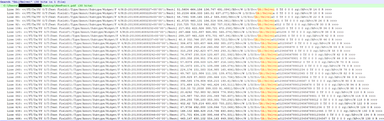 作为一项实验,我使用FoxitPhantomPDF 6.0.5.0618创建了一个空白pdf,并添加了30个表单字段,保留了它们的默认名称。结果是:最后一个表单字段被赋予一个Helveia0123456789012345678901234567的对象名,第一个名为Helvei。来自notepad++: