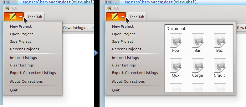 下面的例子(左)是我所拥有的,我希望通过添加非菜单小部件来实现类似于右边模拟的东西。如果QMenu不能做到这一点,那么在任何地方是否都有指南来产生类似的结果(也许可以让一个更标准的小部件充当上下文菜单)?