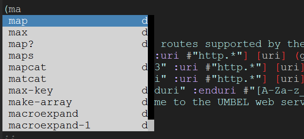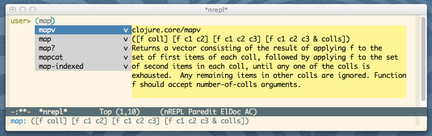 然而,我确实改变了一些设置,比如他正在使用的主题等等。我一直在检查以获得自动完成(埃尔多克?我不确定)是否在Clojure中并从我自己的代码中显示函数的docstring。
