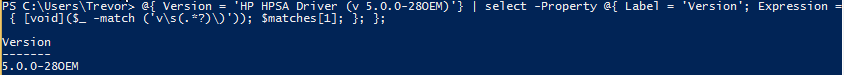 $driverRAIDv = ($data|where-object{$_.Name -eq "$serverName" -and ($_.Description1 -match "hpsa")} | select -ExpandProperty version) -replace 'HP HPSA Driver \(v ','' -replace '\)',''https://stackoverflow.com/questions/24040759
