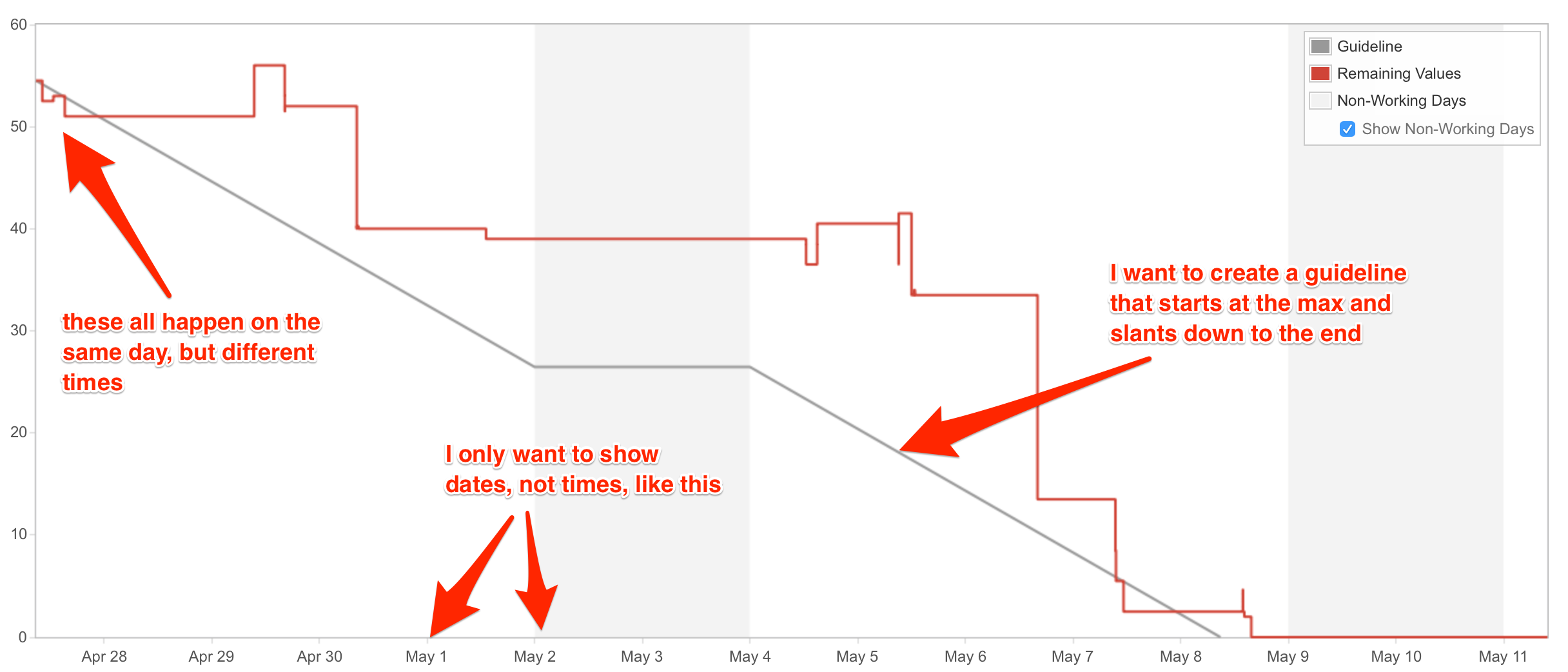 为了向您和其他人展示实现燃尽图是多么容易,我用Chaper0.9.1为您创建了一个。我使用moment.js来格式化日期。