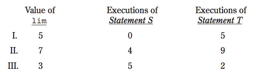 }假设doSome被调用并执行,没有错误。以下哪一种可能的组合用于lim的值、执行语句S的次数和执行语句T的次数?
