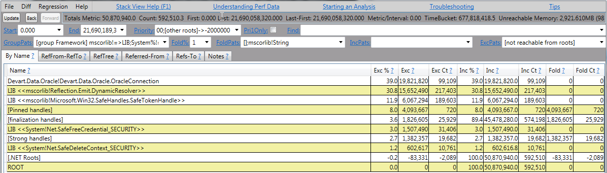 我正在研究wcf应用程序中的一个内存问题,我正在使用perfview来挖掘内存。我们得到了一个基本快照,然后是内存很高的时候的快照。我对它们进行了区分,并查看了我所看到的2,921 at未到达内存的数据。我的理解是,未到达的记忆意味着它已经做好了GC的准备。它已经超过了16个小时,无法到达的记忆一直在上升。