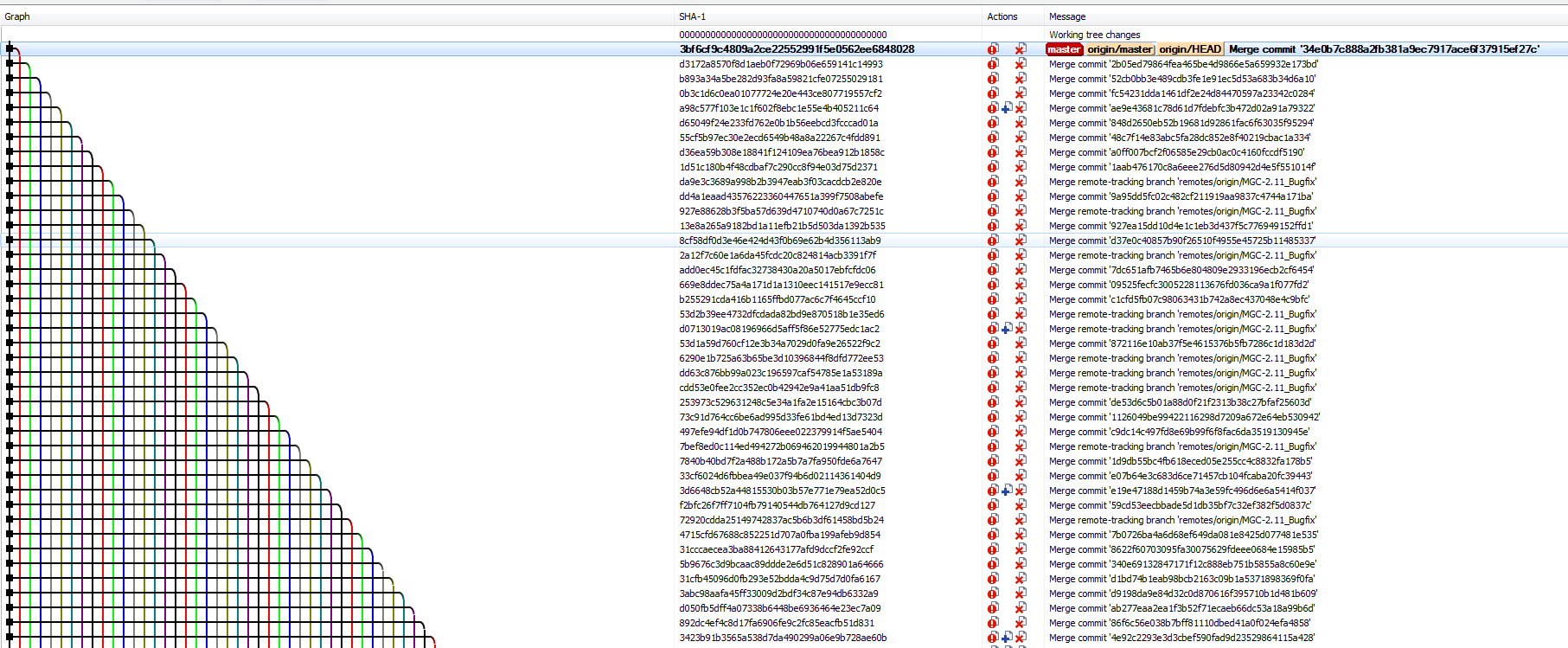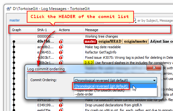 我们发现,如果单击列标题,我们可以选择“按时间顺序反转”,对我们来说一切看起来都很好。不幸的是,tortoise git将--topo-order作为默认设置,这将导致提交金字塔。
