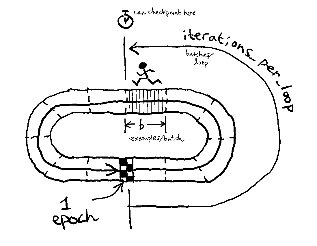 编辑2:下面的是一种可视化正在发生的事情的方法,用一个赛车隐喻。将TPU想象为运行一个具有train_steps示例距离的比赛,它的步幅允许它每一步覆盖一批示例。比赛是在一条赛道上,它比总比赛距离短;圈的长度是你训练例子的总数,每一圈围绕着赛道是一个时代。您可以将iterations_per_loop看作是这样的点,TPU可以停在某种类型的“水站”,这样的话,培训就会暂停,用于各种任务(基准测试、检查点、其他内务管理)。