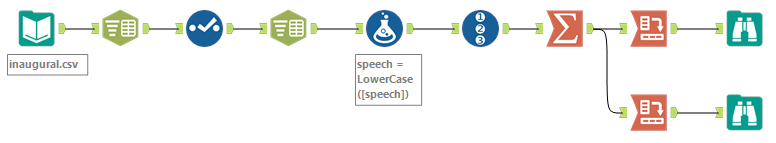 由于Alteryx更像是一个简单的拖放工作流,在这里解释并不简单,但是我已经创建了以下工作流,并将实际工作流本身包含在Alteryx论坛这里中。该工作流使用就职演讲中的术语频率,但应适用于任何文档集合。它只是根据不同的非数字字符分割单词并进行总结。这就是工作流的样子: